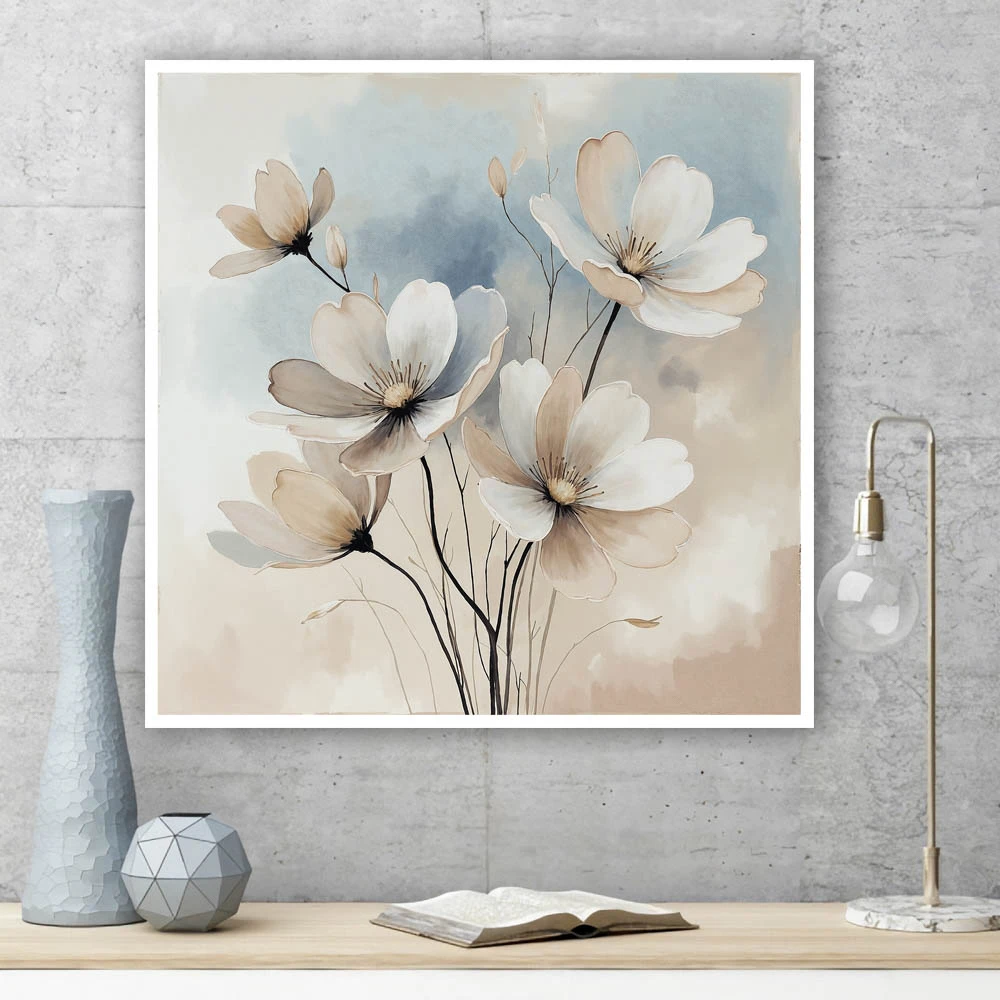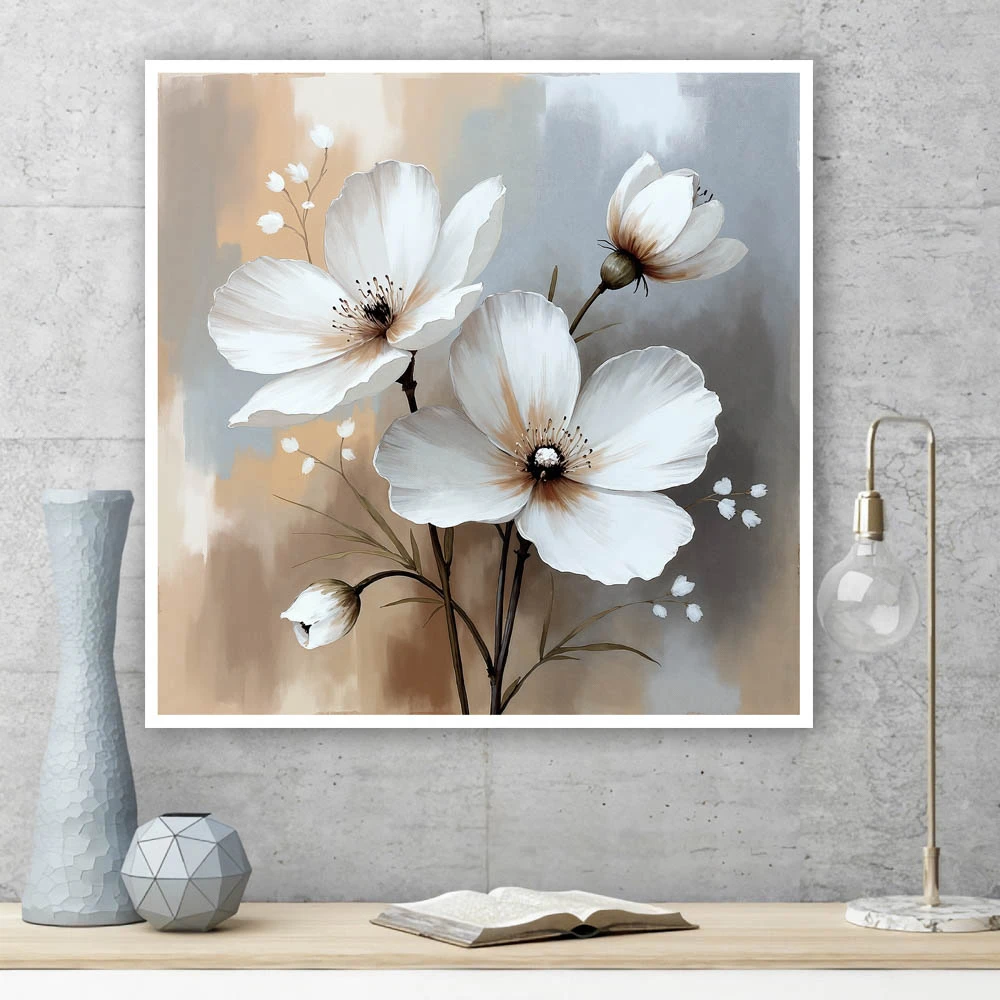 53286:Tablou cu flori albe și fundal gri
