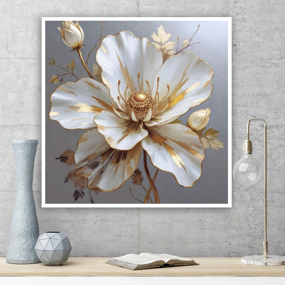 53283:Tablou cu floare albă și detalii aurii